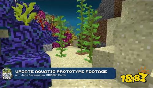 珊瑚:在温暖的海洋生物群系中作为珊瑚礁生成。展示了至少四种颜色的变种:白色、紫色、品红色和黄色,但目前最新公布1.13的珊瑚将只会有一整个方块而不会有半砖和楼梯,可能会在之后的版本更新。