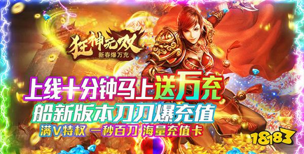 《狂神无双-新春爆万充》这里玩法丰富,装备华丽,全新版本超变让你君临天下,更有酷炫武神,强力佣兵助你对抗凶残BOSS!还等什么?快来化身屠龙勇者,驰骋玛法大陆吧!3职业超强体验,超强变身,极品武神,百倍爆率极品神装,全服轻松杀BOSS,全屏收割,满屏掉落,挂机就可赚元宝!登陆游戏即可得海量特惠礼包,绝版时装、坐骑,翅膀等你来领取!