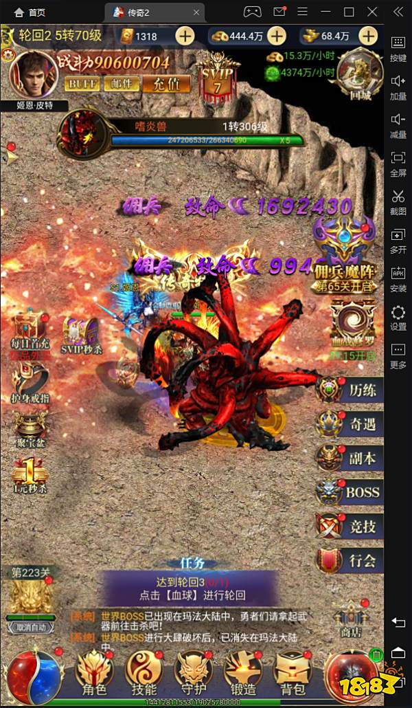 充值比例1:1000★上线5分钟立马送满级VIP还送万元充值卡,满V特权、免费寻宝,30万金币。礼包太多根本写不完!!★1元买648超级优惠大礼包,在线活跃还有海量元宝,元宝太多根本领不完!!★打怪掉充值,满级特权只要点点就有。VIP特权礼包登陆即送,不花一分钱!★攻速巨快,一秒百刀,打怪刀刀爆,还有天神变身带你体验不一样的全新版本★VIP等各种大礼包免费领取,狂欢不止。每日登陆赠送超级豪华大礼,线上活动永不停歇!在线即可领取!★线下充值返利,钻石拿到手抽筋。线下活动礼包,让您实力爆棚!★后缀说明:打BOSS会掉落充值卡加起来就可以获得万元充值,并且免费送的vip还送万元充值卡