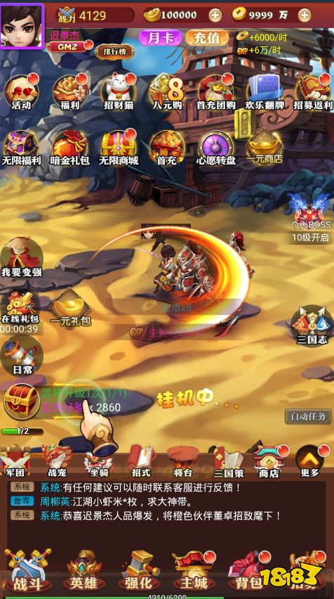 充值比例1:2000★上线就送GM2、10w元宝、金币10000W、★首充礼包连续三天送壕礼,极品武将、顶级装备、海量极品道具等你拿★每天上线送充值卡,开服狂欢累计七天送千元充值,升级更有千元代金券等你领取★无限商城,一次激活永久购买★后缀说明:开服狂欢界面累计七天领取千元充值(激活累充活动)