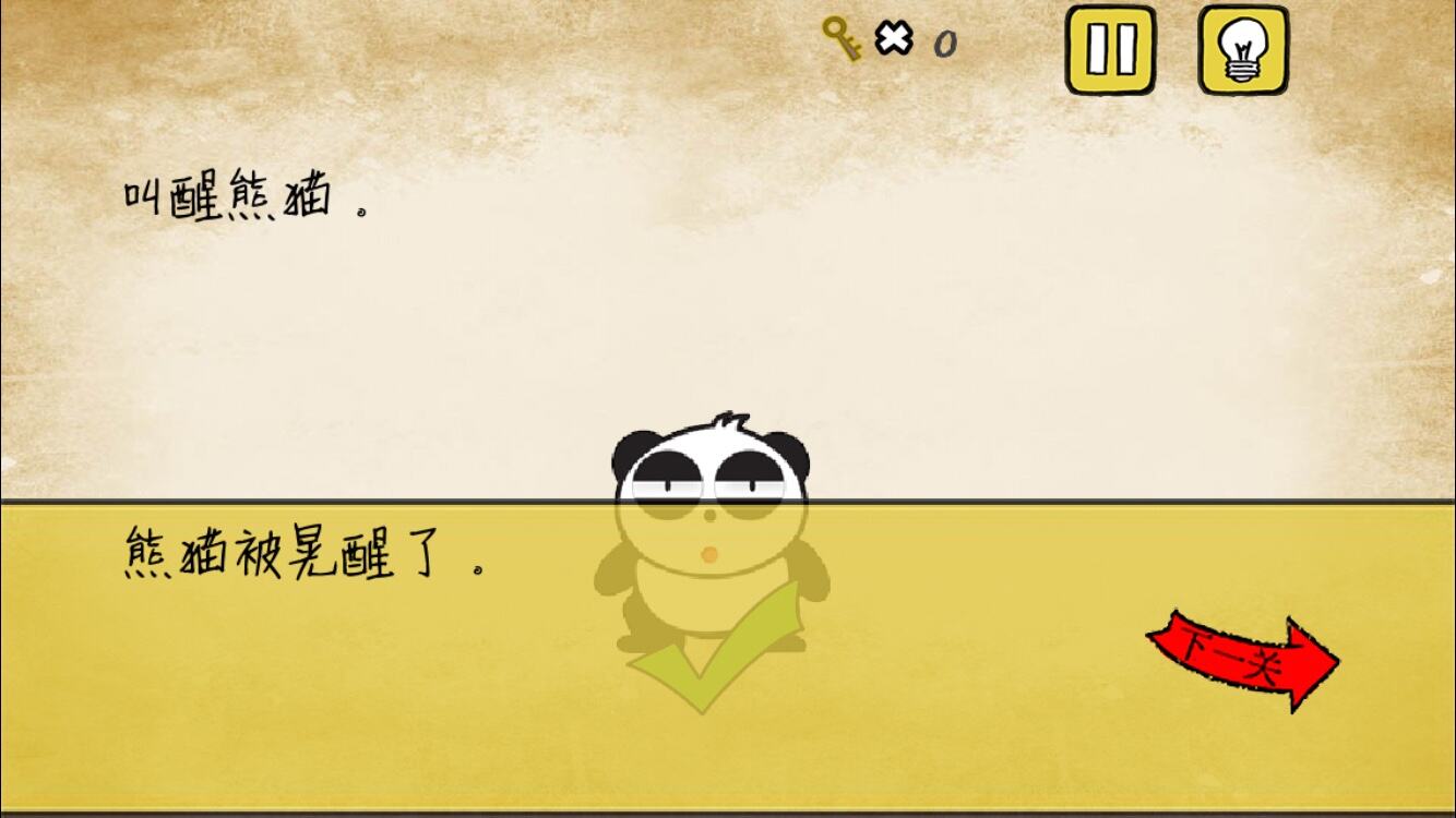 《最囧游戏》又挂了第2关 熊猫睡着了,你要想办法叫醒它,怎么办呢?点击屏幕不管用,大声喊它也听不见,只能试一下摇晃手机了。嘿!果然醒了。看来运气不错,可以去买一注彩票试试了。