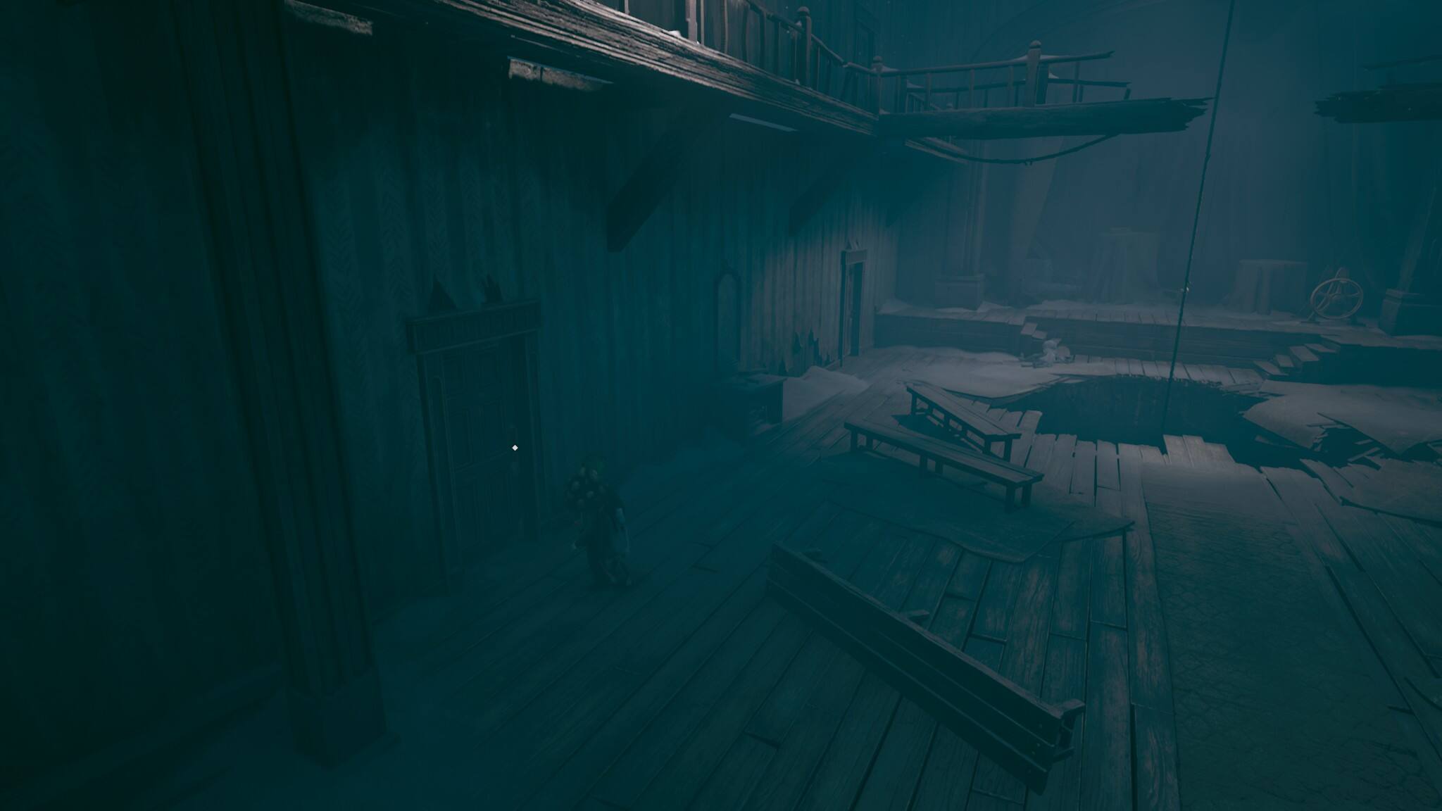 进入中间有一根绳悬挂一个尸体,和三个敌人的房间,击败敌人后一定先不要和绳子互动(强制结束章节),先去左下角开门