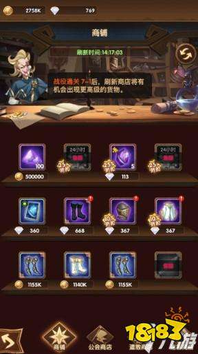 道具商店:道具商店可以让我们不用通过放置和推图就能够获取到较高级别的装备、碎片、粉尘甚至是特定阵容的卡片(目前只有绿裔蓝卡),但是其中性价比最高的莫过于每天都会打折的用少量钻石就能够兑换的24h金币收益和粉尘收益,要知道这两个东西可是最缺的呀!