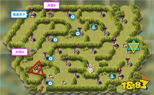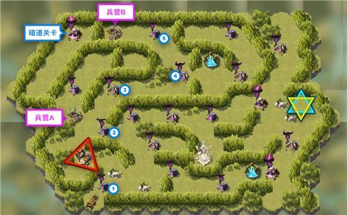 另外左边的暗道关卡有着数个小宝箱奖励,这里需要用三个绿裔英雄通关左下的红三角关卡,才能够打开草丛的通道。如果凑不到三名绿裔族英雄,在两个兵营中补给一下即可。