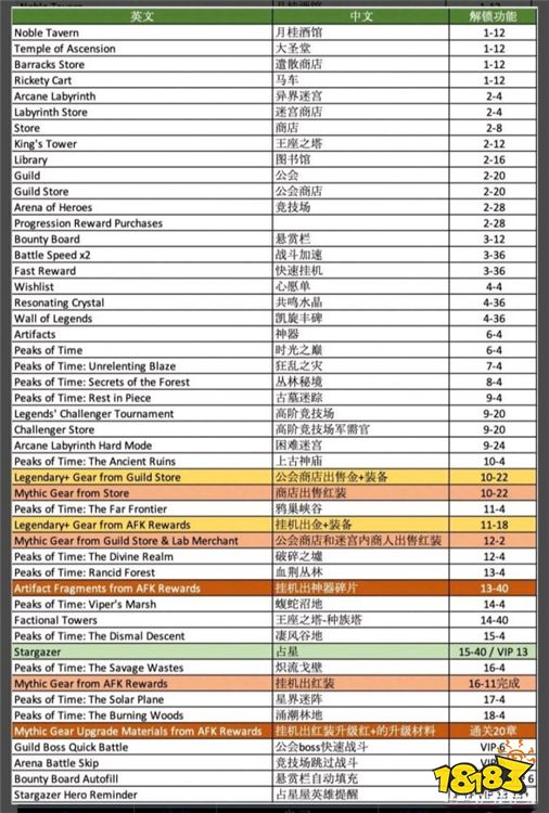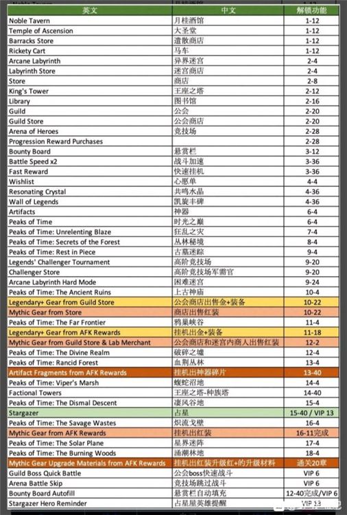 首先根据上图的挂机收益表来看,我们可以发现关卡进度不仅影响着挂机收益,并且还是解锁重要功能的条件。前期主要以解锁功能为主,中后期的关卡也是增加了挂机收益。