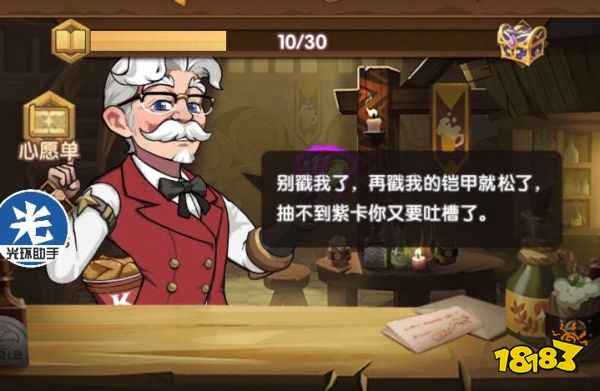虽然lls联名你永远看不懂,但是吧不得不说这次还是很用心的,埋了个小彩蛋,众所周知,抽卡前不弄哭肯德基老爷♂爷是不会出紫的(然而弄哭了也没有),但是老爷爷他不会哭,他只会这一句
