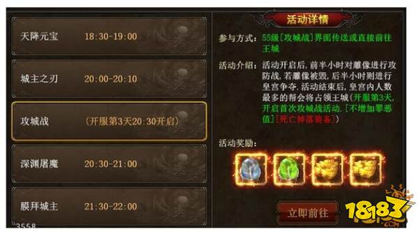 (1)新区开服第3天晚上开启首次攻城战,首次占领王城的帮会将会获得5000元宝攻城红包。