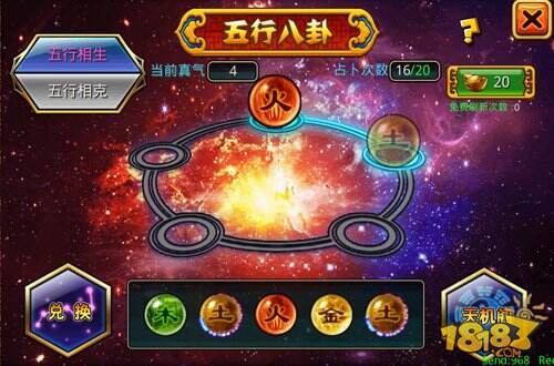 进入到玩法界面时,首先需要选择“五行相生”或者“五行相克”,它决定了收集五行属性球的顺序。当选定其中一个后,点击右上方“刷新”位置的按钮启动玩法。当五行八卦启动后,需要从下方的属性球中选择其一,当被选的属性球符合当前五行阵所需属性时,阵中会自动出现该属性球,同时会指示玩家下一个所需属性。每选择一次属性时会获取少量分数(此时扣除一次占卜次数,每天占卜次数有限):五行相生对应获取“真气”、五行相克对应获取“元气”,当集齐五行属性后会获取大量分数;随着集齐次数的增加获取的分数也更多。当备选属性中没有出现所需属性时,可以通过消耗元宝刷新出新一批属性球,此时不会扣除占卜次数。