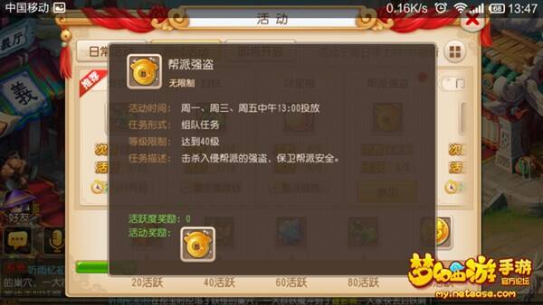 参加条件:等级≥40级,队伍人数(必须同帮派)≥3人。