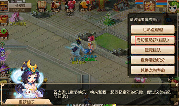 儿童节活动期间,少侠还可以组队去完成童梦仙子的考验,通过考验后,童梦仙子会把各位少侠送回童年中的童话世界,完成童话世界中的任务。