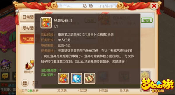 梦幻西游手游重阳节活动中的“登高极远目”是个喜闻乐见的“娱乐活动”,主要就是在玩耍中获得节日的快乐奖励,关键是看运气和自己的把握,那么这里小编把自己的一些经验分享给大家,希望能够给大家在参加这个活动上提供一点帮助。