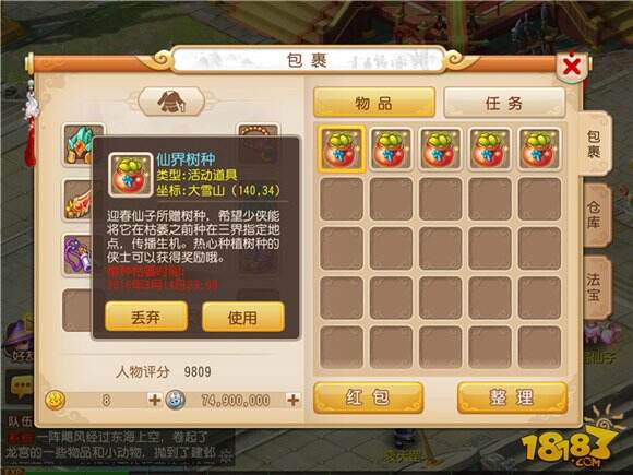天庭特派迎春仙子下界将仙界树种播撒在凡间,希望三界侠士积极种植,以让绿色遍布三界。带着迎春仙子送来的树种,去完成种植任务就能获得经验和物品奖励。