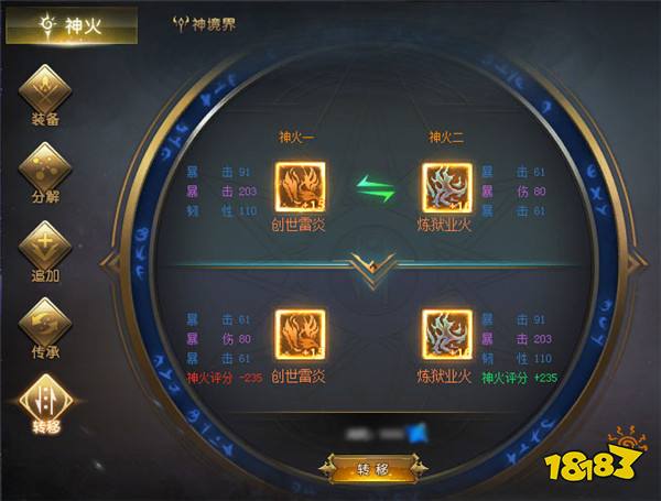 (2)只能成功转移神火副属性,且传承后副属性颜色标识不会发生变化,与原有神火的副属性颜色标识保持一致;