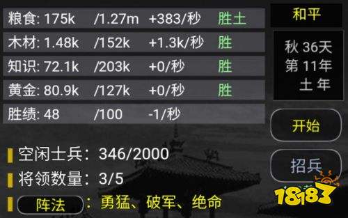 轮回了4次,终于通关!!主要就是刷木头,通关时人口200,伐木场200,军备220,步兵220,知识和农田40,矿场80。只要刷怪了马上就杀,保持一直胜记,对应的五行年份就把人口大部分都投进去其余年份都投到樵夫。武将是2个诸葛亮一个张飞{更新前诸葛亮是步兵,更新后是弓兵了?},更新了一下好像出了阵法?部分武将病种变了?但是已经没有兴趣再玩一遍了。