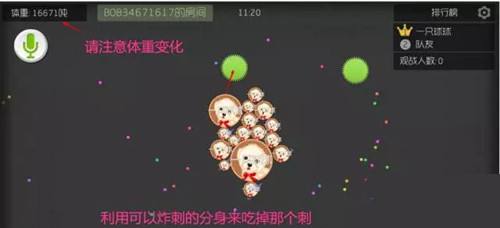 攻略描述:在保证自己足够安全的情况下,如果没有队友配合,16分身炸刺是最快获得体重的单刷办法,因为当分身达到16个的时候,再此进行炸刺,不会再分裂出新分身,会直接给炸刺的分身增加体重,省去了被炸的四分五裂的困扰。除此之外我想不到单刷时还有比这个增加体重更快的方式了