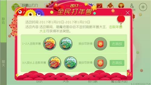 活动内容:活动期间,猎魔地图中会不定时刷新年兽大王,击败年兽大王,可获得年货奖励。