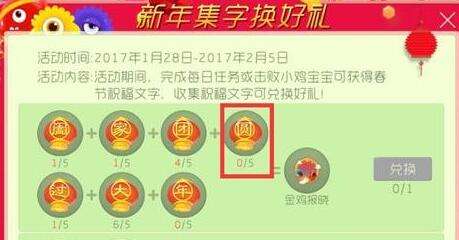 圆字确实不容易获得,需要大家花费更多的时间参与游戏,比如参与挑战小鸡年兽,获得咯咯哒银蛋和咯咯哒金蛋,打开之后,里面获得“圆”字的几率还是比较大的,同时还有参与谁是任务达人的活动,获得礼盒,也有机会开出“圆”字,当然还有登陆有礼活动中的喜拜年礼盒,里面开出圆字的活动也极大,这些都需要大家花时间哦,而且还要有耐心。