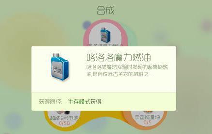 咯洛洛燃油只能通过打生存模式和开宝箱获得,而无法通过基础材料合成,所以要想获得咯洛洛燃油是十分困难的,不过有了本卡咯洛洛燃油秘籍,会增加你打到咯洛洛燃油的几率哦。