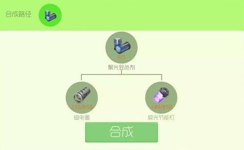 目前,聚光显色剂只能通过基础材料合成获得,它的合成公式是850个磁电圈+850个极光节能灯。总之,小编刚看到这个材料的合成图时,都懵圈了,这都是些什么材料啊,要不要这样,简直是要人命哦,不知道要打多久的猎魔模式才能合成哦,只能尽力了!