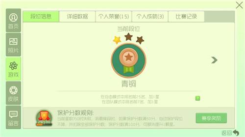 全新游戏数据界面分为段位信息、详细数据、个人荣誉、个人成就以及比赛记录。
