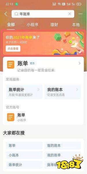 2、也可以直接查找关键字【2021年账单】、【账单】等,点击【你的2021年账单来了】进入;