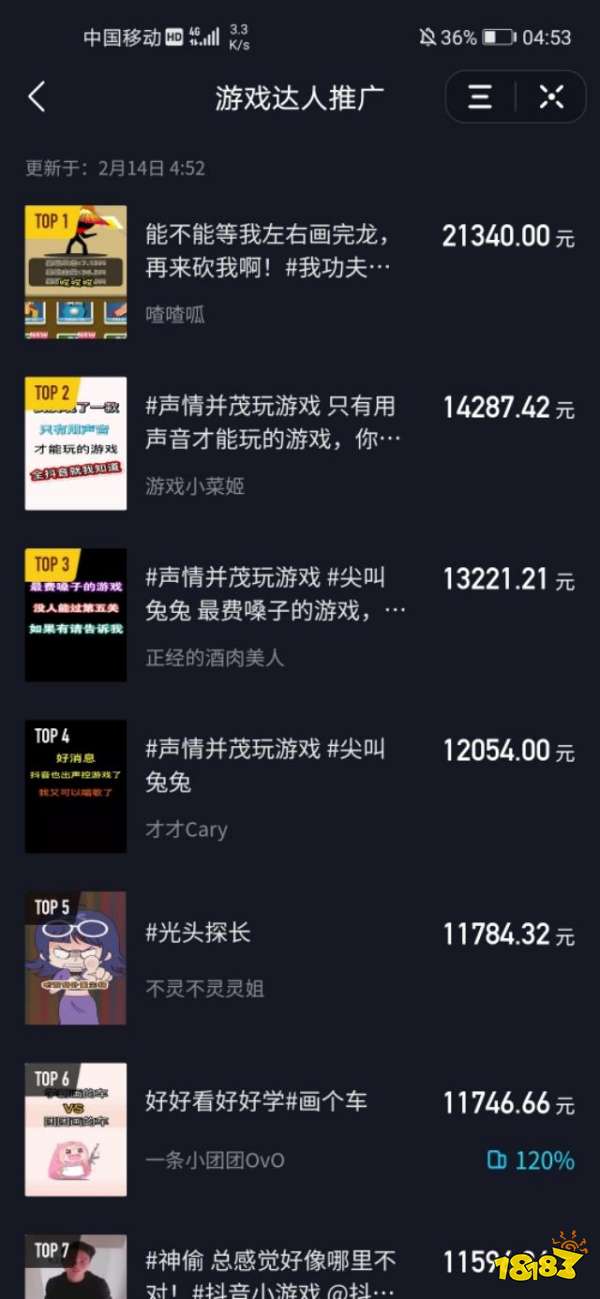我们先看下面这张图,这是抖音上游戏达人推广的排行榜,第一名收益已经2万元以上了!