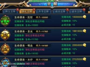 觉醒系统是新版本中的核心内容,分为5个不同的觉醒内容。玩家可以消耗金币或钻石进行觉醒操作,觉醒成功可获得相应的觉醒被动技能,增加伤害、生命值、伤害率和免伤率等各种属性,进一步提升角色实力。