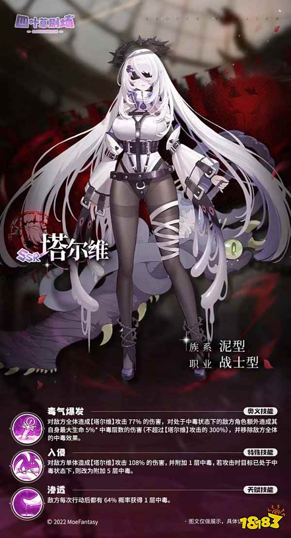 手游《四叶草剧场》公布了全新SSR级演员塔尔维的资料,该演员族系为泥型,职业为战士,该角色可以在战斗中赋予敌方单位“中毒”效果。