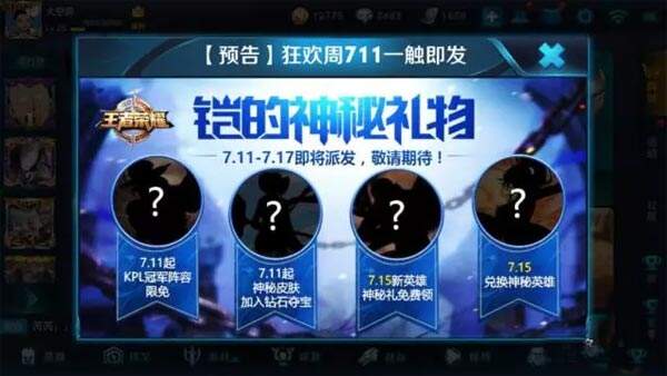7月15日,新英雄,神秘礼免费领。目前即将上线的新英雄是铠,看那图片有点像铠的皮肤模型,7月15日上线这个时间点也是很正常。至于神秘礼,这个真没想到,难道是要免费送皮肤吗?