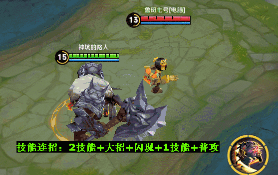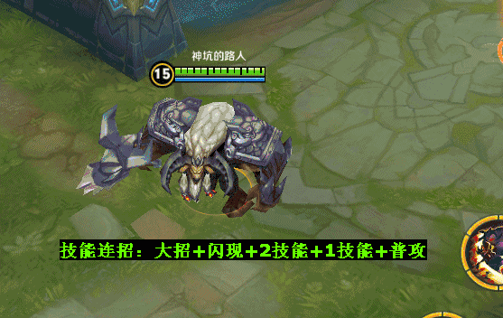 连招说明:2技能击飞敌人后的转身大招要判断对方是否走出你的大招范围,所以搭配闪现可以很好的让技能衔接起来!
