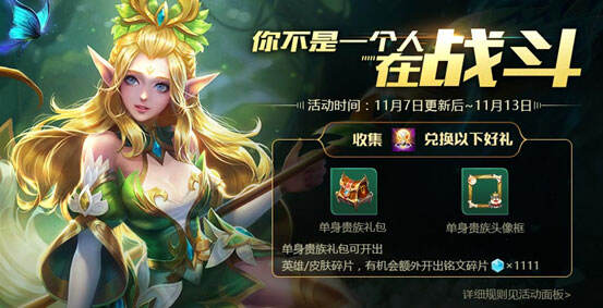 参与对战(不含人机)掉落11.11特供照明物品,每日上限4个。可用于兑换头像框、单身贵族礼包。