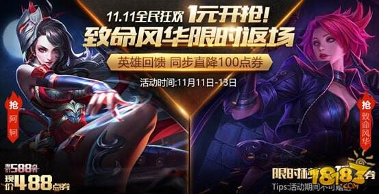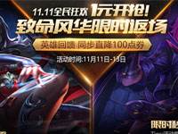 11.11全民狂欢,你不是一个人在战斗!阿轲-致命风华返场回馈,1元开抢!好友、战队开黑总动员,单身贵族头像框、英雄/皮肤碎片、大量铭文碎片等你来拿!