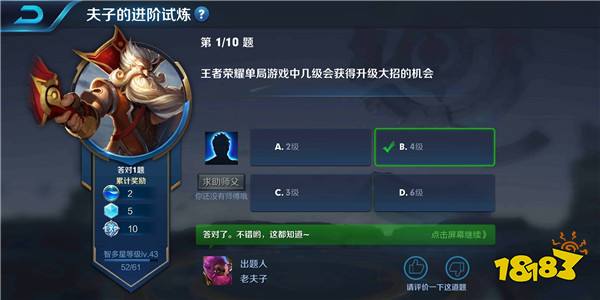 王者荣耀夫子的进阶试炼问题:王者荣耀单局游戏中,几级会获得升级大招的机会?