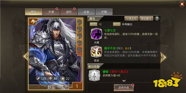 游戏内的武将定位有很多种,而且有部分武将的定位还有两样性,比如上图的赵云,既能承受不少的伤害又能造成不错的输出,定位是半肉输出,我们可以根据阵容其他成员的选择,让赵云装备不同的装备来改变其定位。