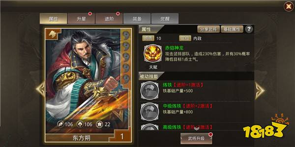 首先每个武将都有其定位,这个在点开每个武将的属性那里就能看到,以上图为例,虽然东方朔是个橙色品质的武将,按理说应该很强力。但他的定位是内政,其被动技能也都是跟资源生产有关,这样的一个武将如果你硬要他上阵杀敌,未免有点强人所难。