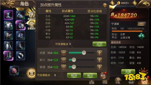 角色每提升1级,就能获得10潜能点,可以自由分配在战意、耐力和敏捷上。其中战意加点影响角色的攻击和命中,耐力加点影响角色的生命、闪避和韧性,敏捷加点影响角色的防御和暴击。三大属性分别影响角色不同维度的成长,因此想培养什么样的角色,就看各位的自由发挥了。