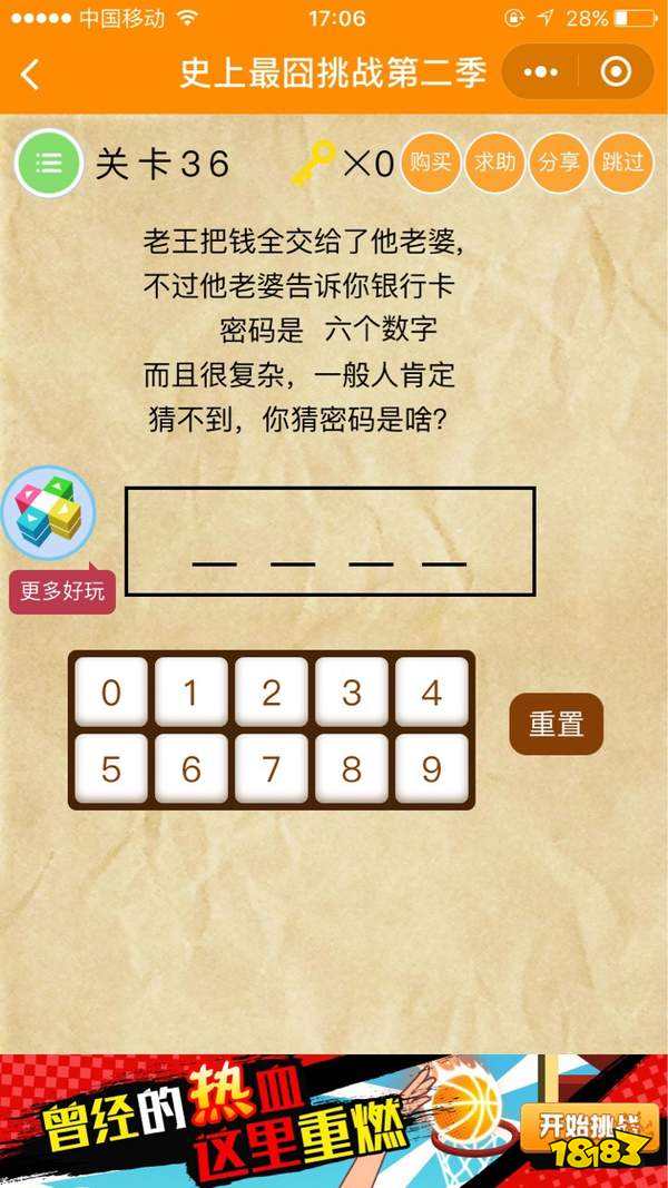 36 老王吧钱全交给了他老婆,不过他老婆告诉你银行卡密码是六个数字,而且很复杂,一般人肯定猜不到,你猜密码是啥