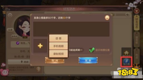 在空间的右侧点击【写心情】即可发表关于你今天的所遇所见,分享游戏心得等等,可以用文字+图片,或者语音、视频。