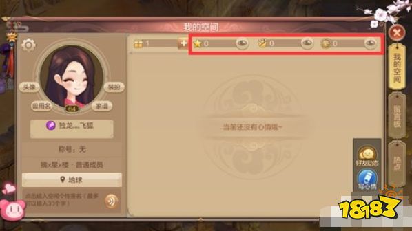 以下为空间礼物、访客和赠送鲜花,点击旁边的【眼睛】可以看到自己的人气值、魅力值、豪气值等。更多功能与QQ空间类似,幻想家们可以去游戏内尝试一下!