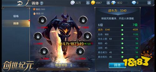 铸体系统从另一个角度可以理解为资源回收系统。玩家可以通过此系统熔炼多余的绿色及更高品质的角色、坐骑、翅膀装备,并获得魔能进行铸体。铸体可以较大幅度提升人物战力,同时激活人体潜能,依次解锁六种不同被动技能,且这些技能等级都可以使用魔晶进行提升。而魔晶来自熔炼红色品质装备产生。