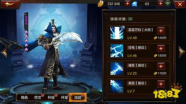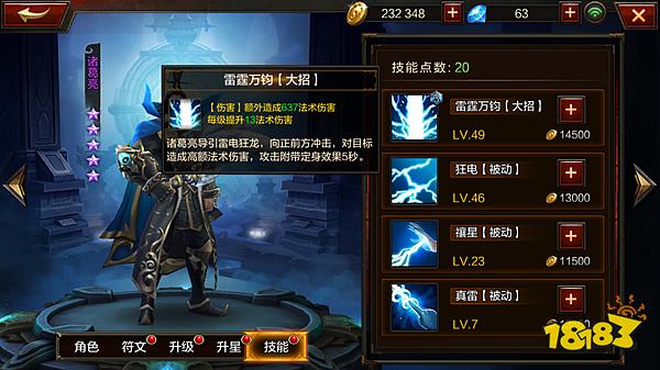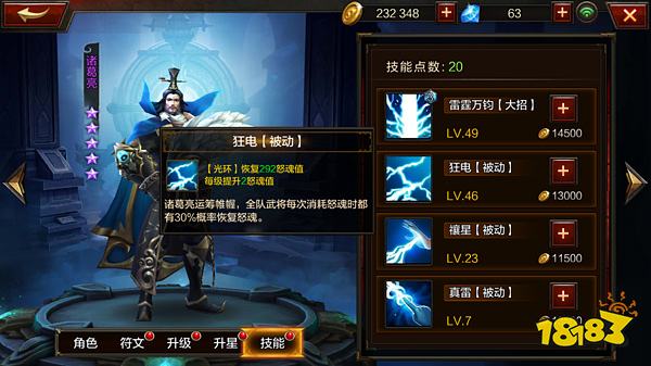 诸葛亮:首先诸葛亮的获取非常容易,前期登录活动就会送出诸葛亮。可别小看送的武将,在游戏前期,诸葛亮的输出能力还是不错的。诸葛亮的大招【雷霆万钧】可以对目标造成高额的法术伤害,并附带一定的定身效果,在竞技场中可以起到不错的控场作用。2技能【狂电】有怒魂恢复的效果,保证了整个己方队伍的武将在使用怒魂后有比较高的几率即刻恢复,基本上不会出现武将怒魂不够用,而导致技能放不出来的情况。