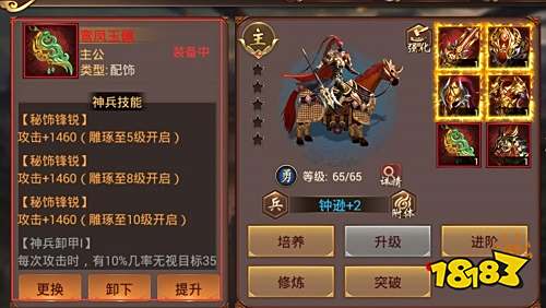 红色以上品质的装备和饰品即可开启神兵技能系统。同时,装备锻造、饰品雕琢达到一定等级后神兵技能自动激活。神兵技能可以提升武将的属性及战斗BUFF。各位玩家可以从 装备/饰品 界面进入这个功能。