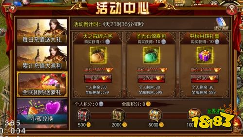 活动时间:2018年8月21日9:30~2018年8月28日9:30。全民团购盛宴,活动期间玩家每次购买团购礼包,即可获得个人积分,并计入全服团购积分,全服团购积分达到要求后即可解锁目标阶段奖励,同时个人积分满足要求即可领取对应阶段礼包内容。沙城福利处精心准备了天之戒礼包、圣光石惊喜包及月饼礼盒等超值福利包供大家精选,达到奖励目标后还将发放幸运筛子、金色双魂碎片、试炼勋章、传奇神器碎片礼包等限量道具,为老铁们的中秋大战做好准备。