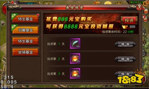 在2018年9月18日9:30~9月28日9:00活动期间,玩家只要投资5888元宝就能连续7天领取基金奖励哦~转生金丹,转生魔法药,转生金疮药,转生血参,转生防御药水等等你来领取~
