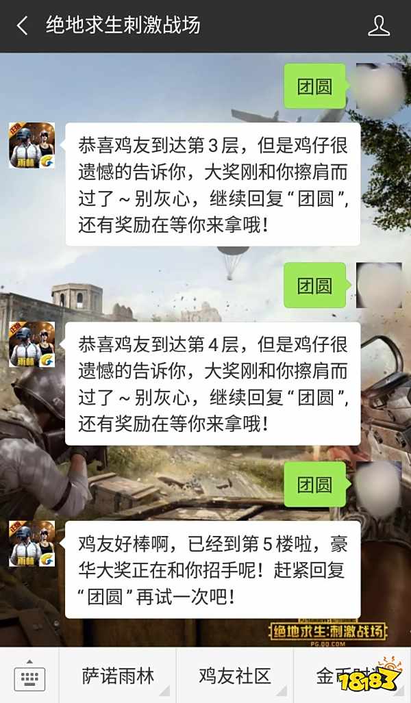 鸡友们在绝地求生刺激战场微信公众号消息栏中,发送【团圆】,只要参与盖楼,特定楼层即可中奖。