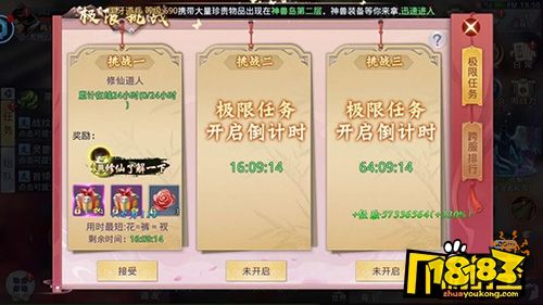 “修仙”必定是一个不断突破自我的过程,此次《莽荒纪2018》所更新的“极限挑战”就是以急速蜕变为目的重要提升玩法。此活动在每个月的1、3、5号和15、17、19号开启两轮,每轮3个任务。玩家需要在限定的时间内选择合适的任务接取,并尽快完成,否则超过时间将被视为挑战失败。