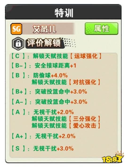 最让艾薇儿引以为傲的就是她特性中的“突破投篮命中+6%”,加上训练营中的突破投篮命中+1.5%,艾薇儿在突破后可以有+7.5%的投篮命中提高,效果非常惊人。
