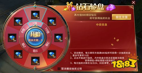 活动规则:活动期间,使用绑钻即可参与钻石抽奖,最多参与10次,转盘分内外轮盘,外盘决定基数,内盘决定倍率,获得绑钻=基数X 倍率,最低88钻,最高将获得16880钻!