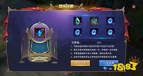 活动规则:活动期间,购买许愿卡参与许愿,每次许愿必得坐骑进阶石、女仆进阶石等成长宝石,并增加许愿值,积累许愿值就有机会得6阶神秘大奖!许愿值越高,中奖几率越大哦!