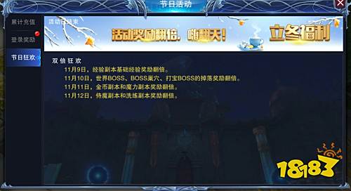 活动规则:活动期间,每日分别有不同副本奖励翻倍,11月9号经验副本基础经验奖励翻倍;11月10号世界BOSS、BOSS巢穴、打宝BOSS掉落翻倍;11月11号金币副本和魔力副本奖励翻倍,10月12号侍魔副本和洗练奖励翻倍。